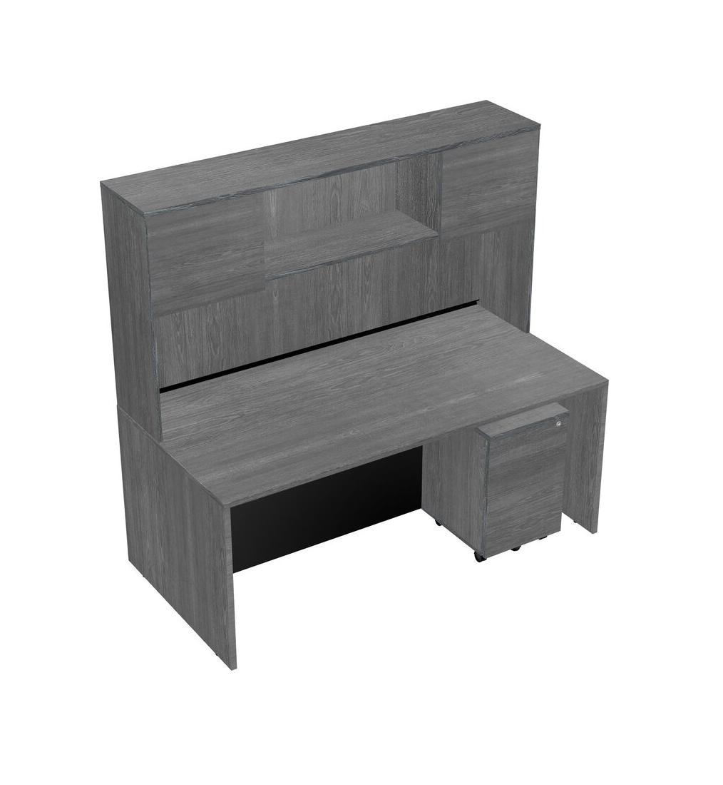 Grey Rectangular Office Desk Plus Grey Wooden Mobile Drawers And Grey Hutch