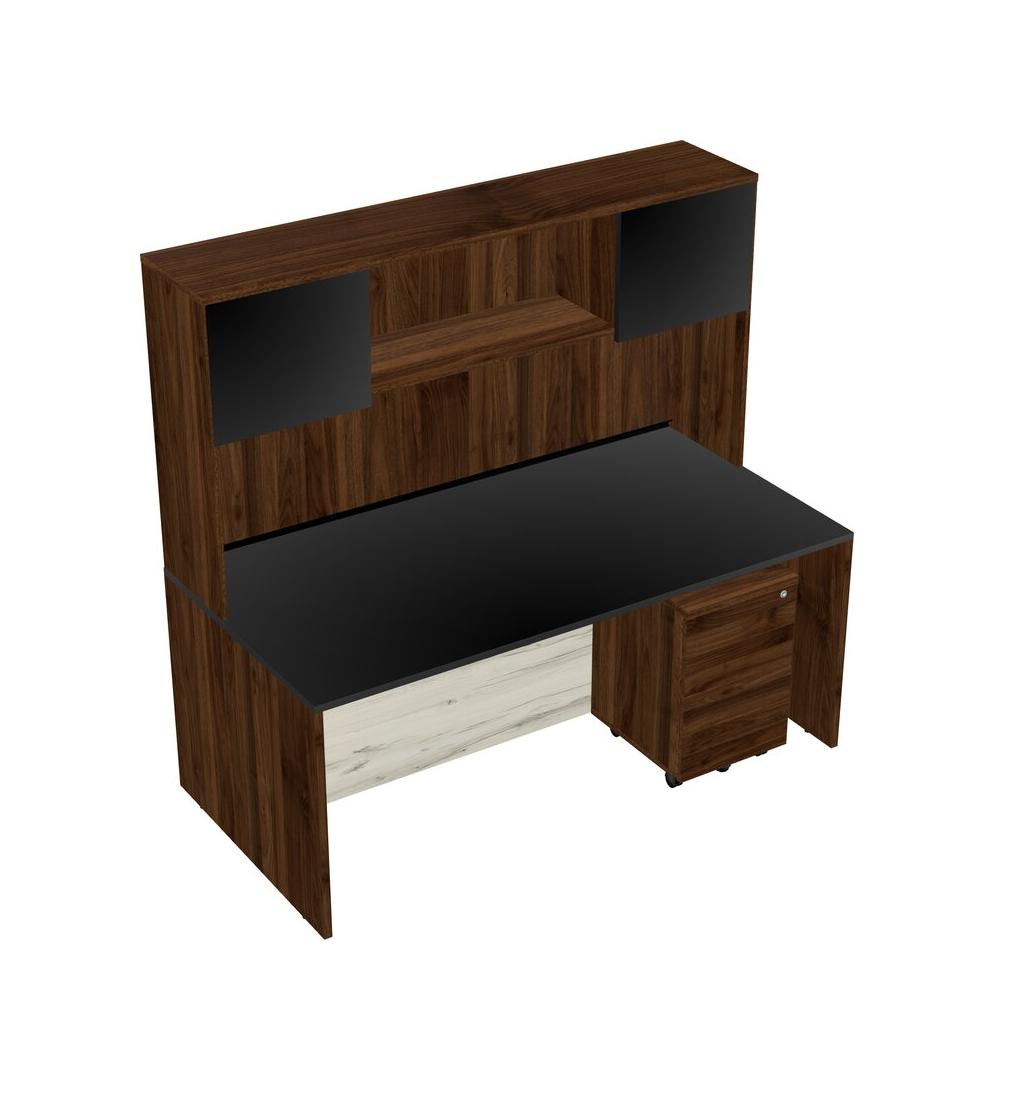 Black Rectangular Office Desk Plus Columbia Walnut Wooden Mobile Drawers And Columbia Walnut Hutch