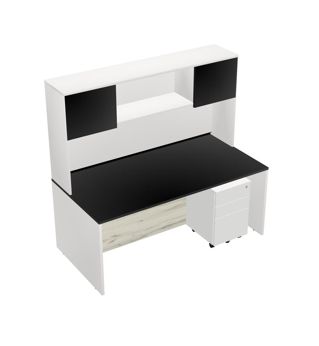 Black Rectangular Office Desk Plus White Wooden Mobile Drawers And White Hutch