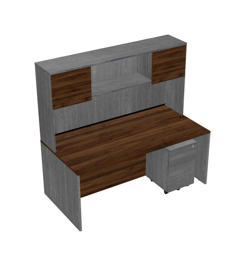 Columbia Walnut Rectangular Office Desk Plus Grey Wooden Mobile Drawers And Grey Hutch