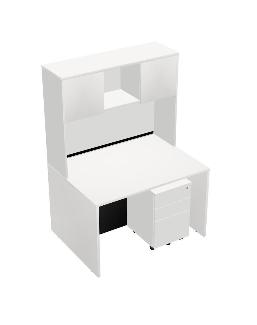 White Rectangular Office Desk Plus White Wooden Mobile Drawers And White Hutch