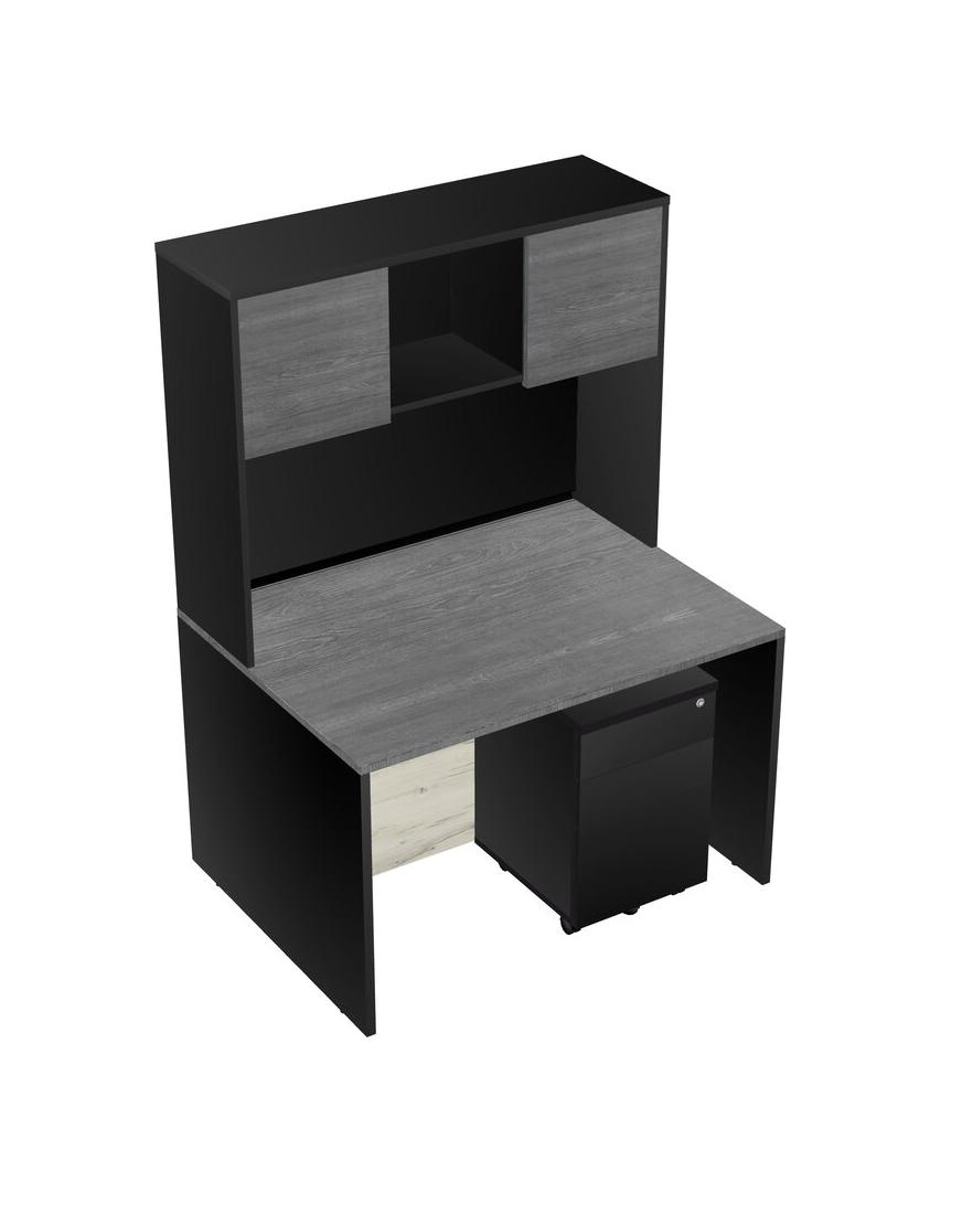 Grey Rectangular Office Desk Plus Black Wooden Mobile Drawers And Black Hutch