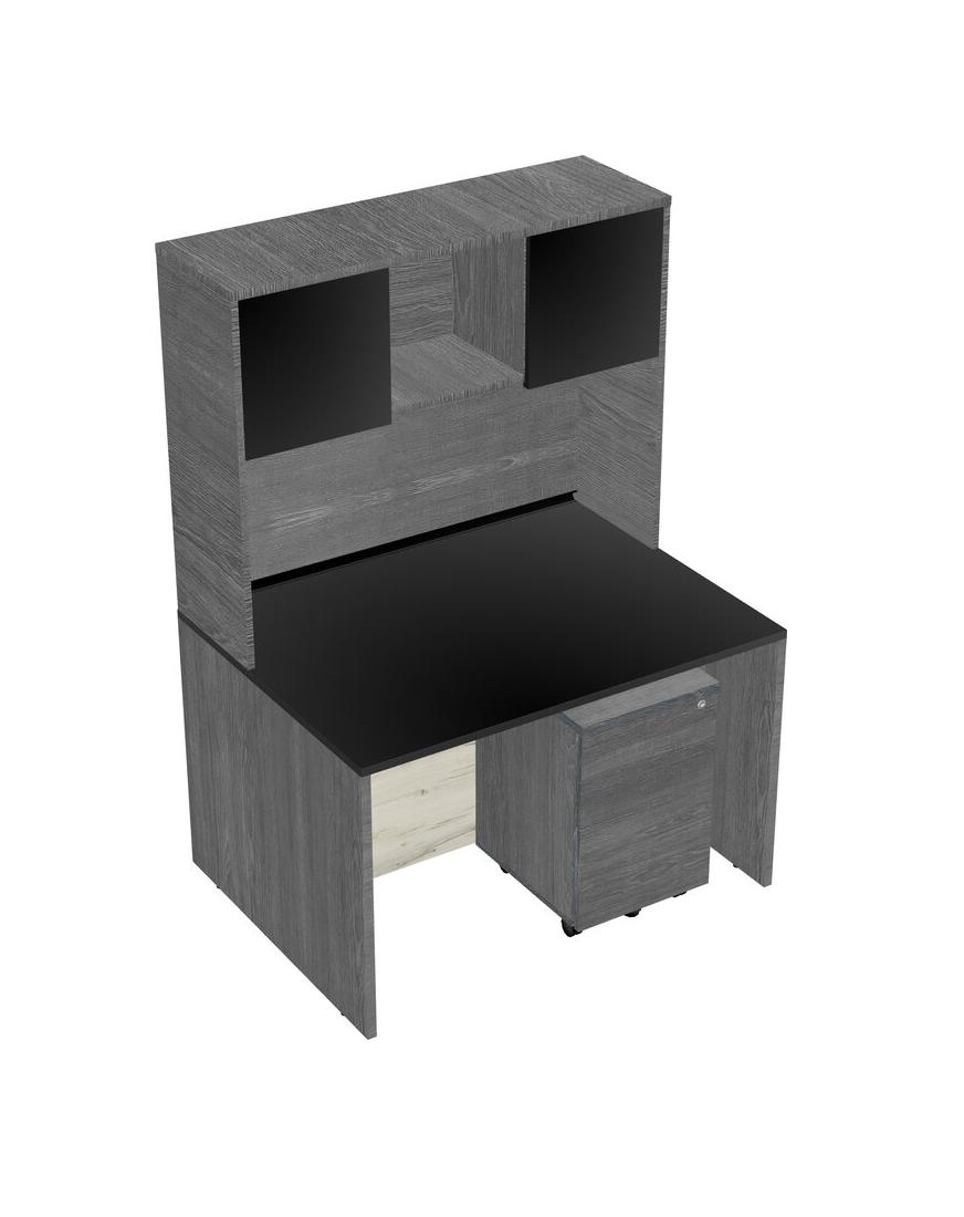 Black Rectangular Office Desk Plus Grey Wooden Mobile Drawers And Grey Hutch