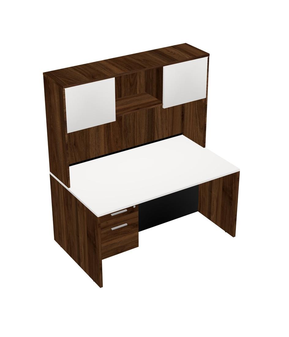 White Rectangular Office Desk Plus Columbia Walnut Hanging Drawers And Columbia Walnut Hutch