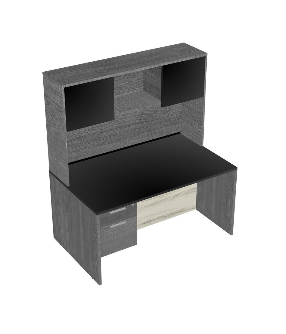Black Rectangular Office Desk Plus Grey Hanging Drawers And Grey Hutch