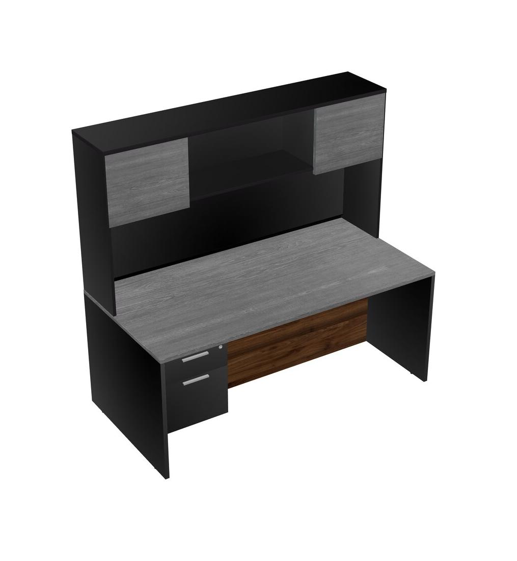 Grey Rectangular Office Desk Plus Black Hanging Drawers And Black Hutch