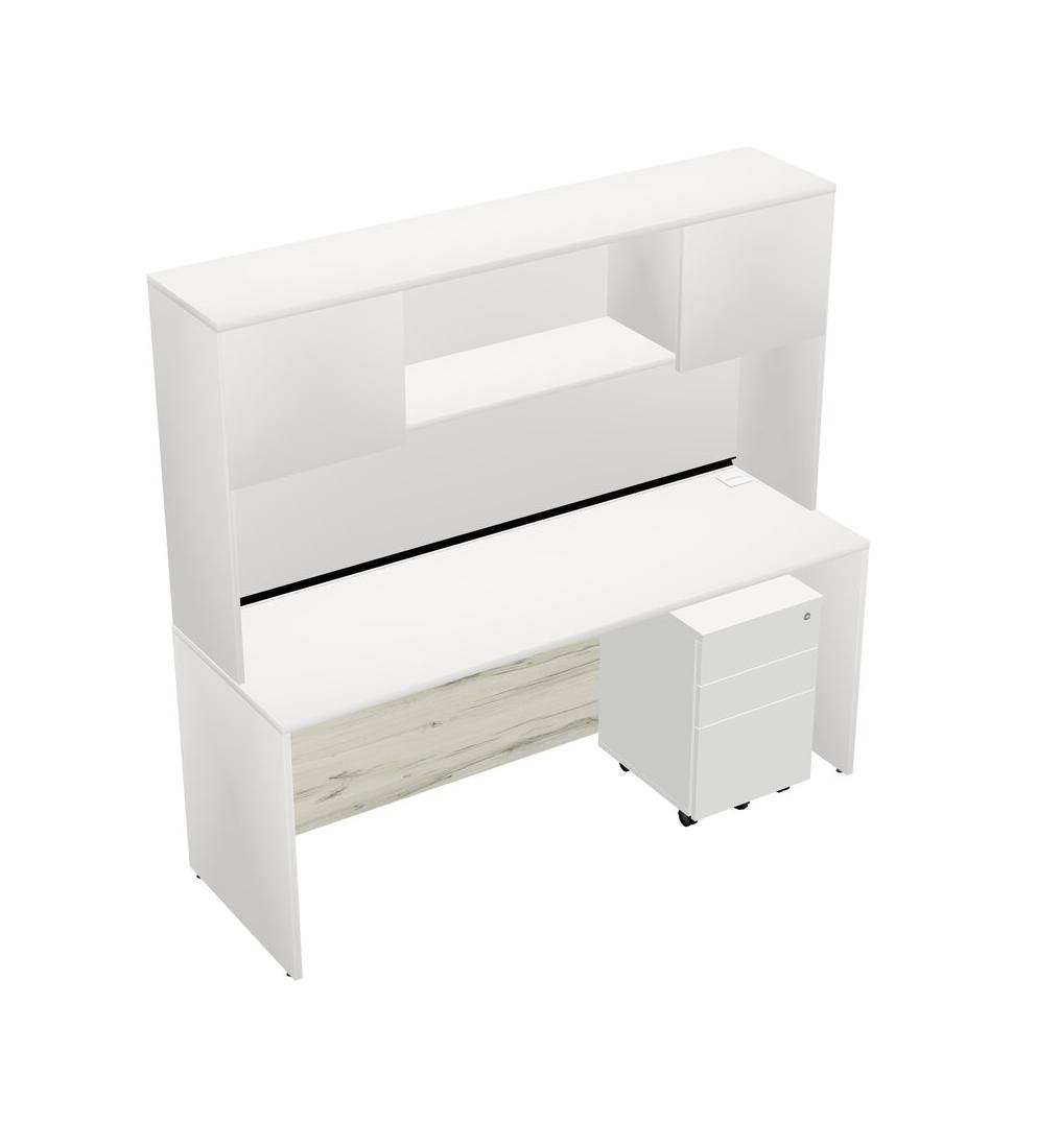 White Rectangular Office Desk Plus White Wooden Mobile Drawers And White Hutch