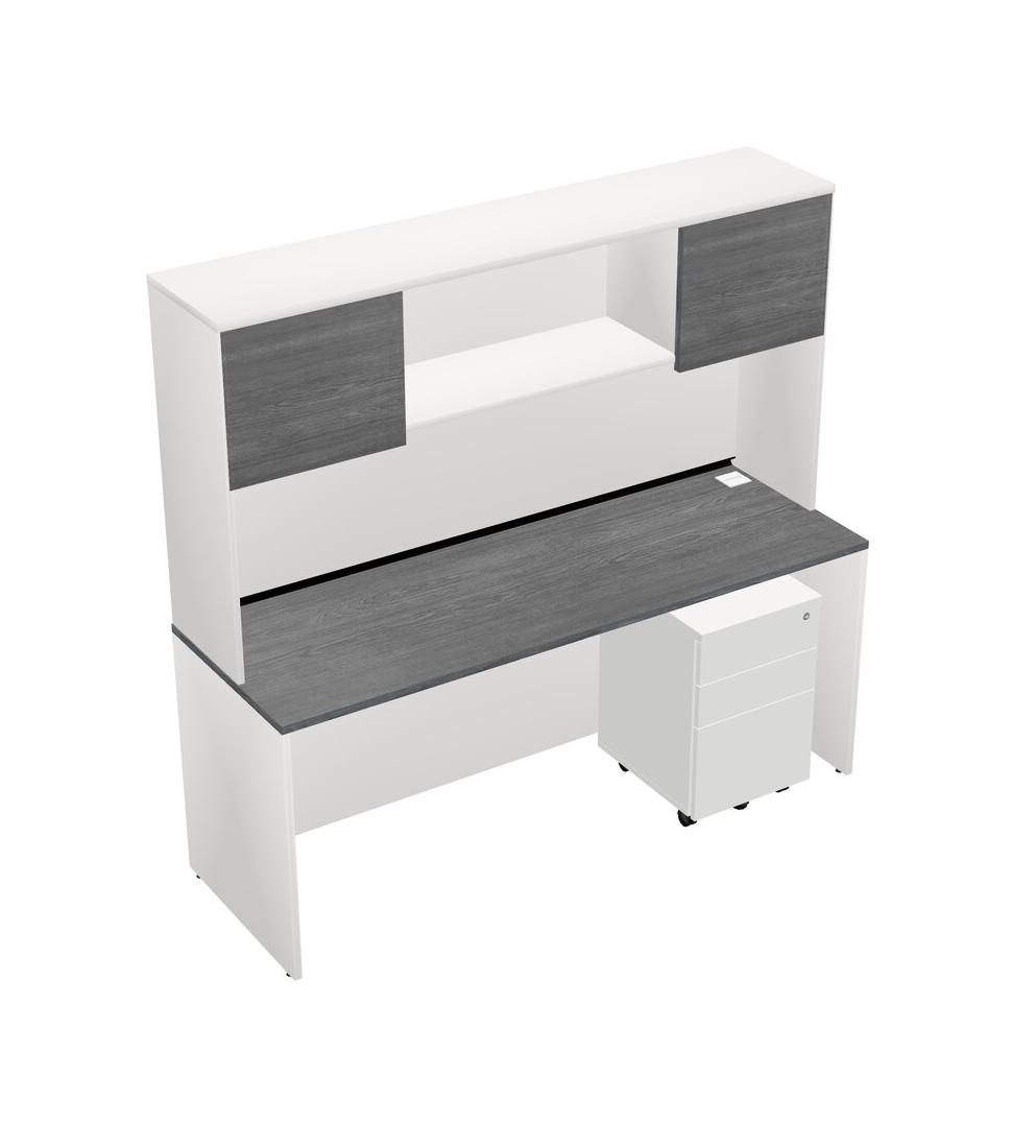 Grey Rectangular Office Desk Plus White Wooden Mobile Drawers And White Hutch