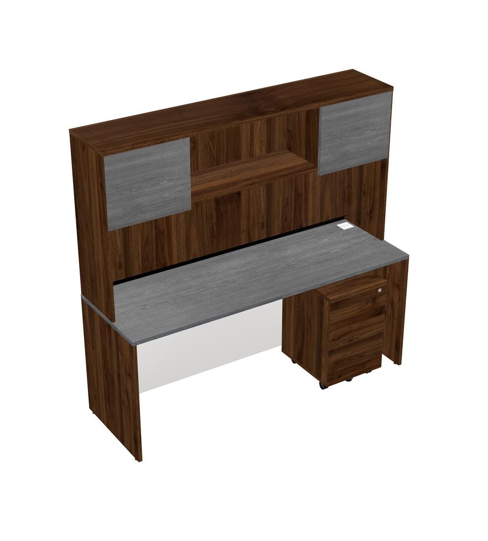 Grey Rectangular Office Desk Plus Columbia Walnut Wooden Mobile Drawers And Columbia Walnut Hutch