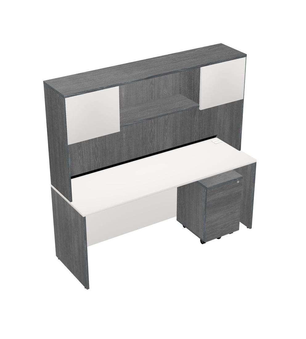 White Rectangular Office Desk Plus Grey Wooden Mobile Drawers And Grey Hutch