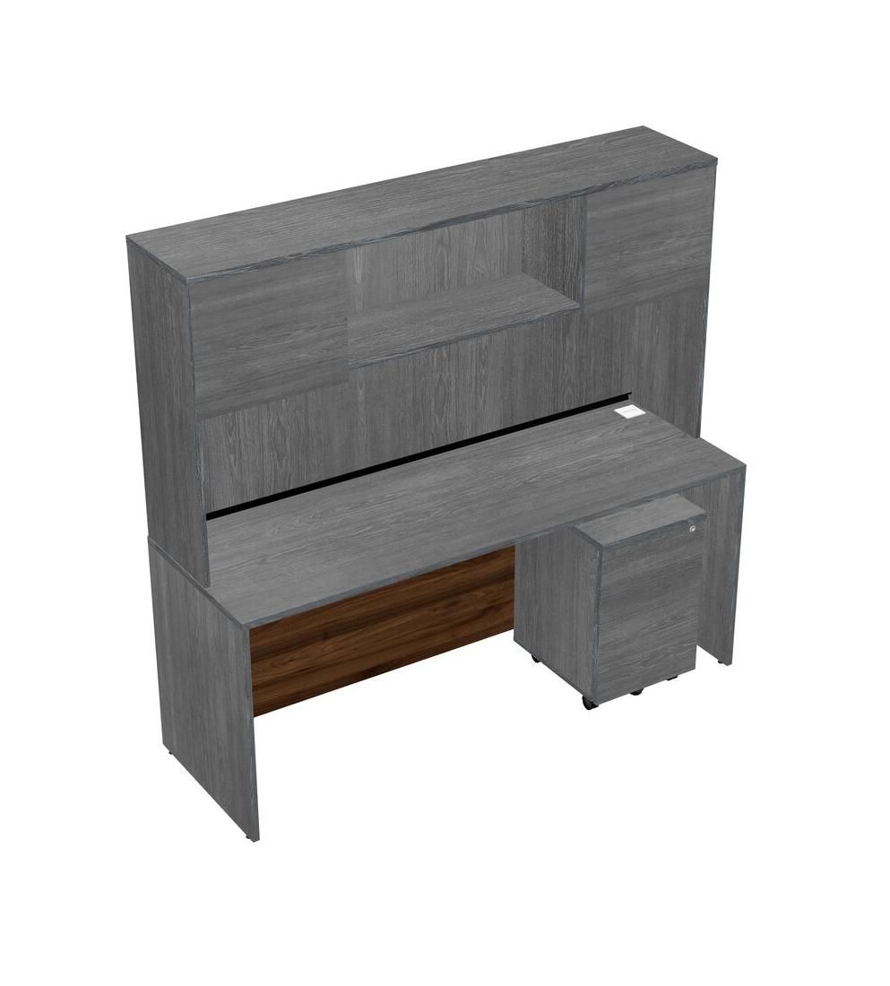 Grey Rectangular Office Desk Plus Grey Wooden Mobile Drawers And Grey Hutch