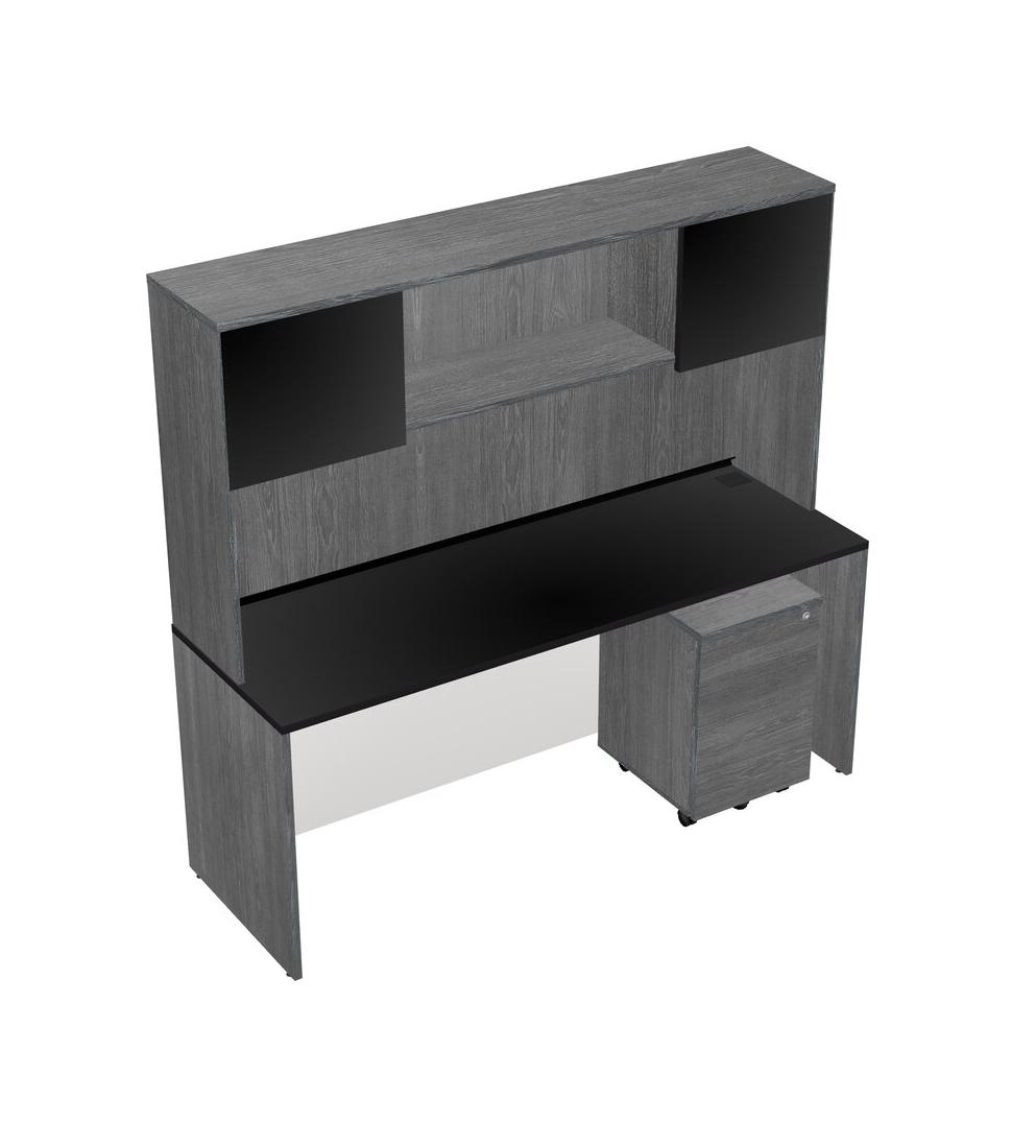 Black Rectangular Office Desk Plus Grey Wooden Mobile Drawers And Grey Hutch