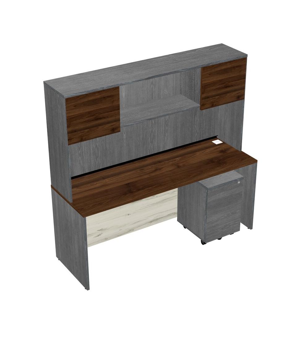 Columbia Walnut Rectangular Office Desk Plus Grey Wooden Mobile Drawers And Grey Hutch