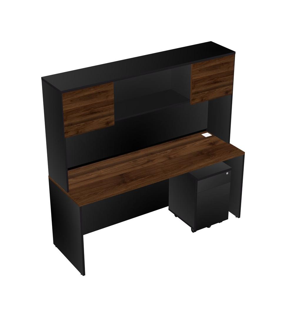 Columbia Walnut Rectangular Office Desk Plus Black Wooden Mobile Drawers And Black Hutch