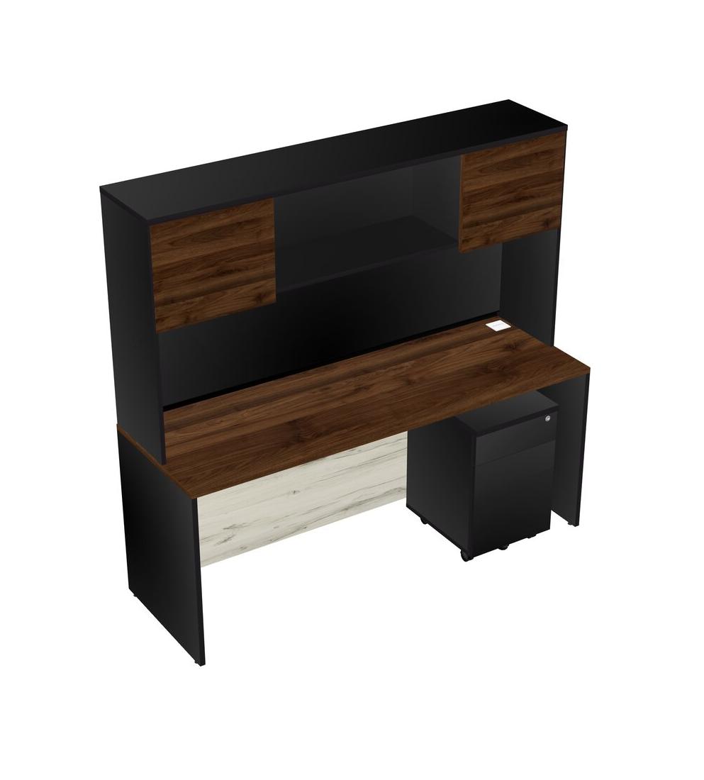 Columbia Walnut Rectangular Office Desk Plus Black Wooden Mobile Drawers And Black Hutch