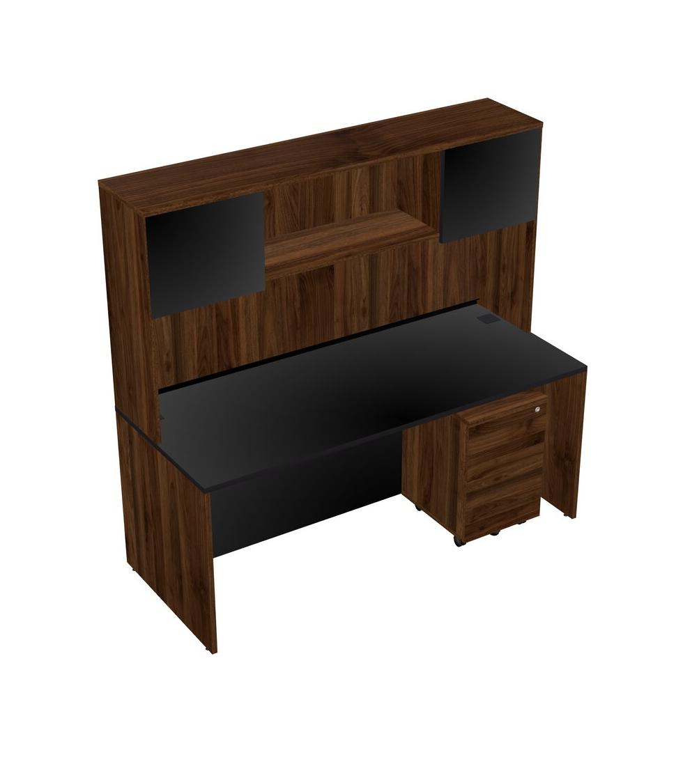 Black Rectangular Office Desk Plus Columbia Walnut Wooden Mobile Drawers And Columbia Walnut Hutch