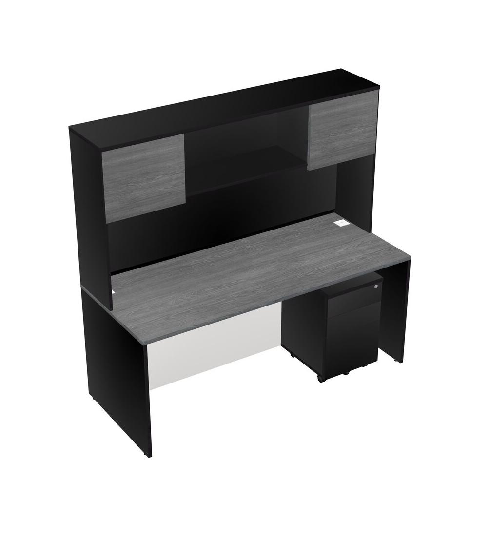 Grey Rectangular Office Desk Plus Black Wooden Mobile Drawers And Black Hutch