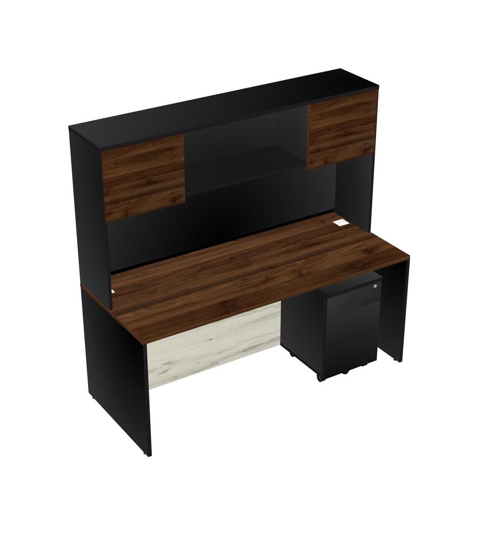Columbia Walnut Rectangular Office Desk Plus Black Wooden Mobile Drawers And Black Hutch
