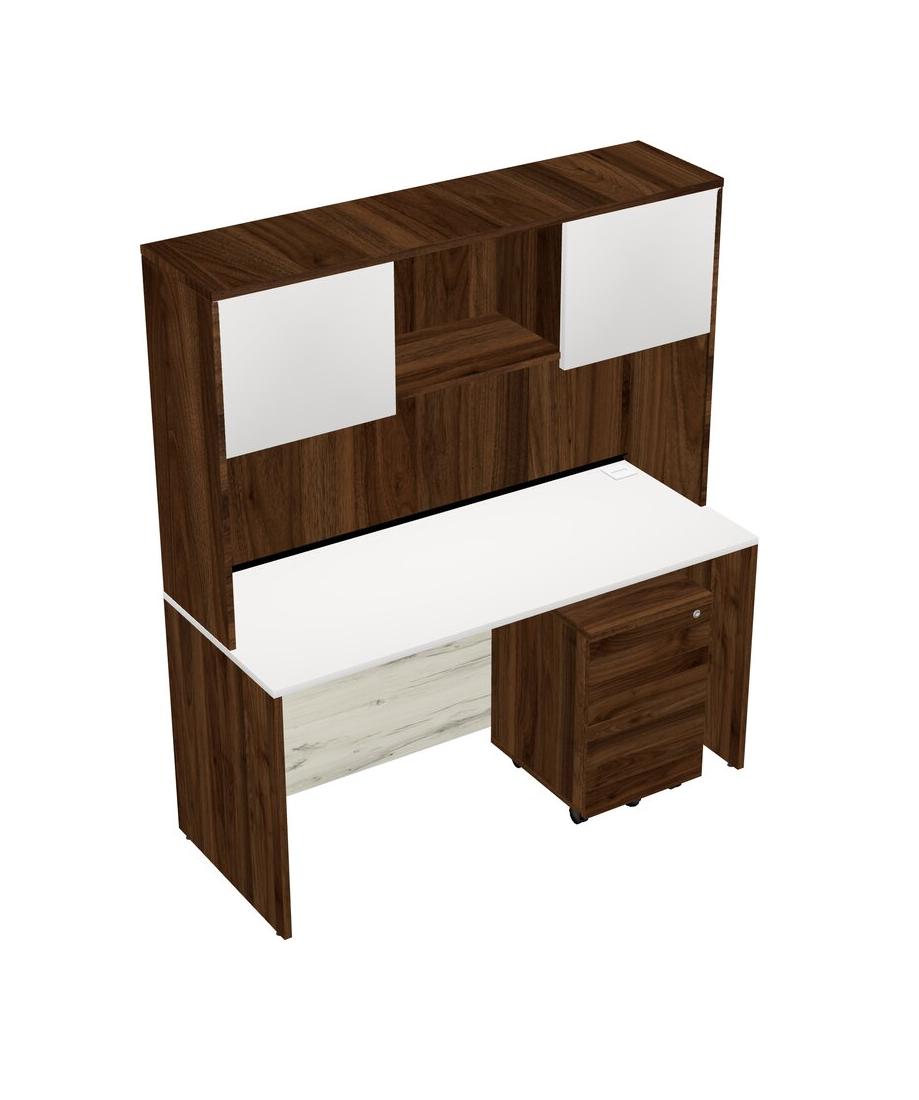 White Rectangular Office Desk Plus Columbia Walnut Wooden Mobile Drawers And Columbia Walnut Hutch