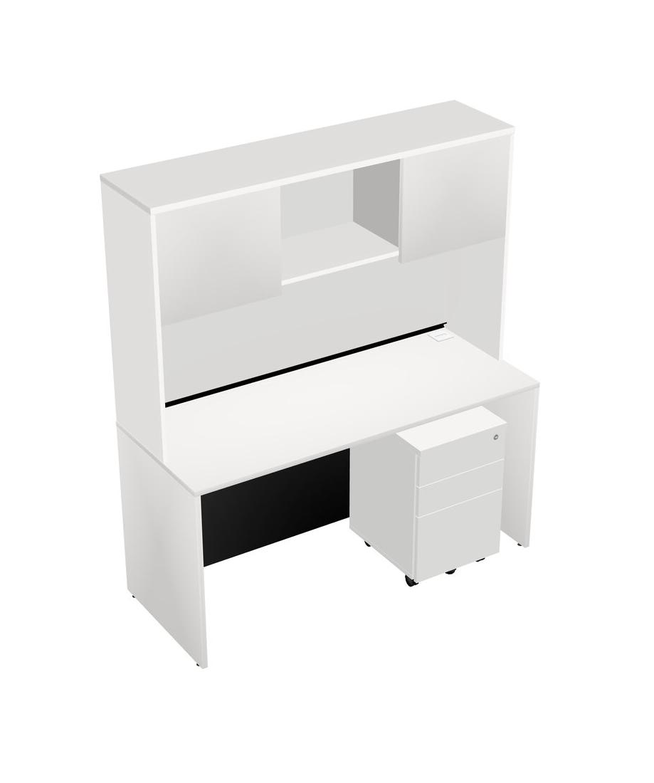 White Rectangular Office Desk Plus White Wooden Mobile Drawers And White Hutch