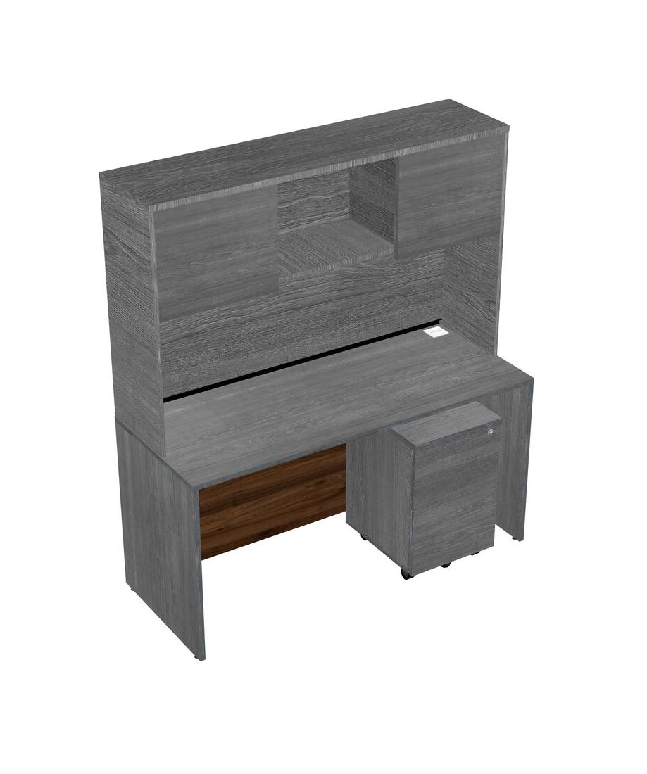 Grey Rectangular Office Desk Plus Grey Wooden Mobile Drawers And Grey Hutch