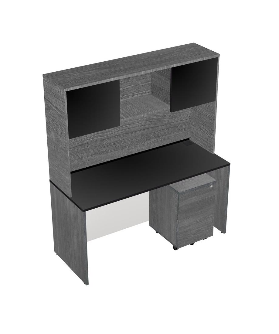 Black Rectangular Office Desk Plus Grey Wooden Mobile Drawers And Grey Hutch