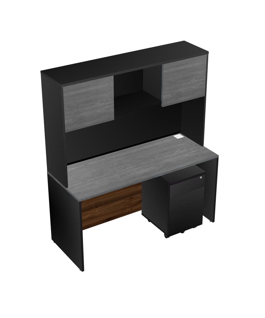 Grey Rectangular Office Desk Plus Black Wooden Mobile Drawers And Black Hutch