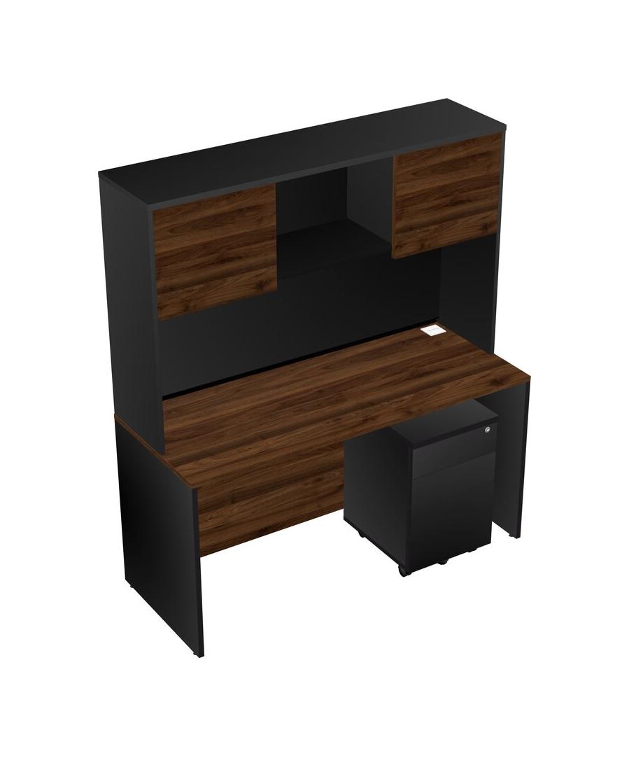 Columbia Walnut Rectangular Office Desk Plus Black Wooden Mobile Drawers And Black Hutch