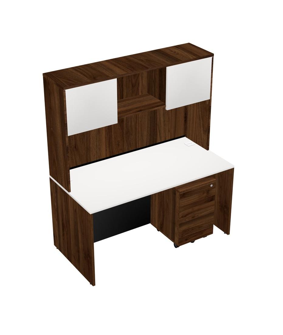 White Rectangular Office Desk Plus Columbia Walnut Wooden Mobile Drawers And Columbia Walnut Hutch