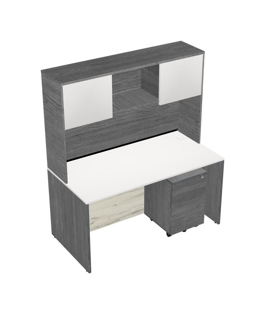 White Rectangular Office Desk Plus Grey Wooden Mobile Drawers And Grey Hutch