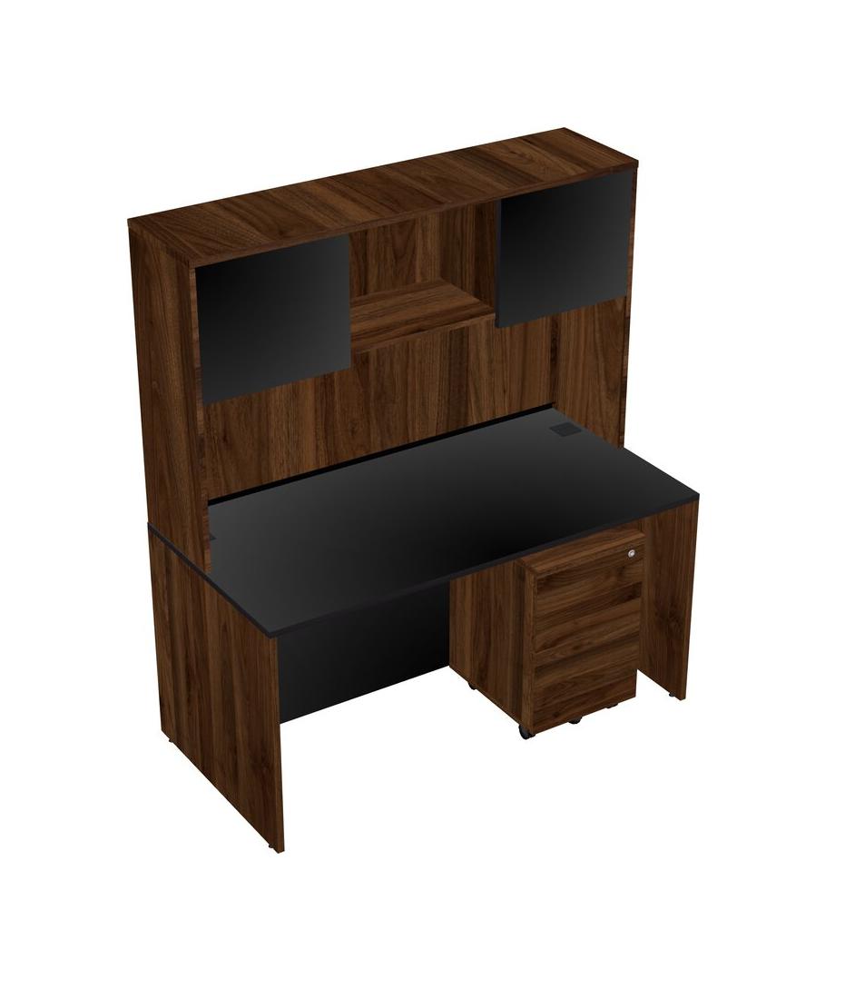 Black Rectangular Office Desk Plus Columbia Walnut Wooden Mobile Drawers And Columbia Walnut Hutch