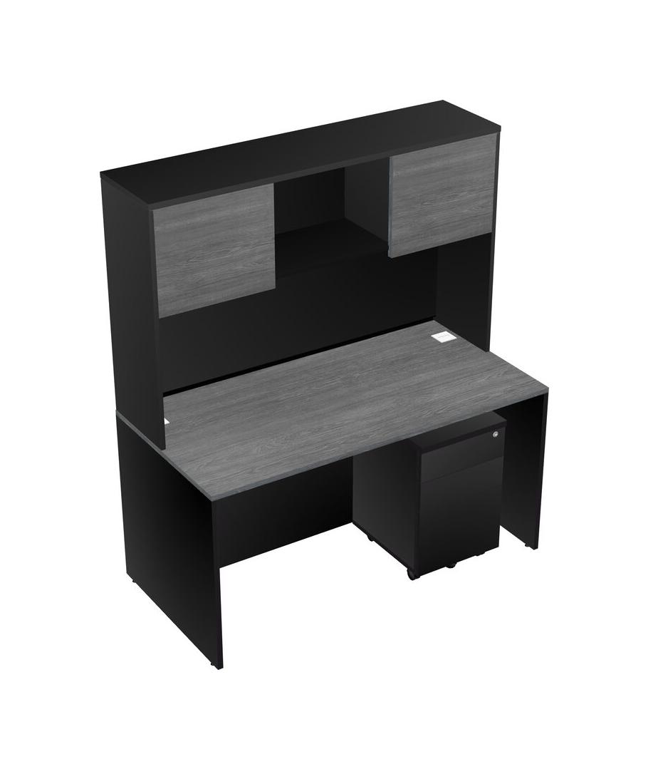 Grey Rectangular Office Desk Plus Black Wooden Mobile Drawers And Black Hutch