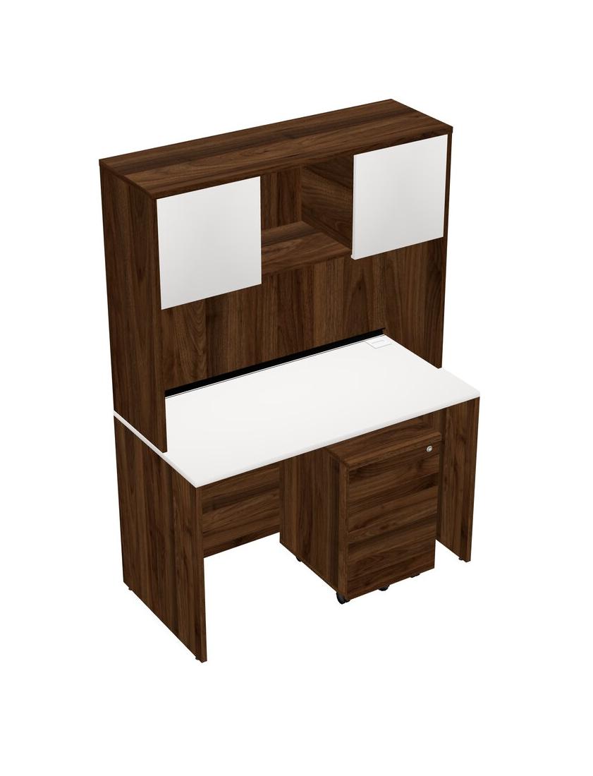 White Rectangular Office Desk Plus Columbia Walnut Wooden Mobile Drawers And Columbia Walnut Hutch