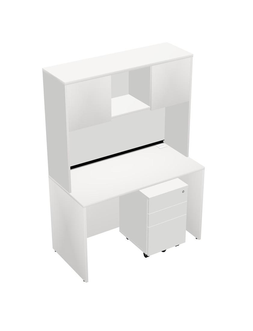 White Rectangular Office Desk Plus White Wooden Mobile Drawers And White Hutch