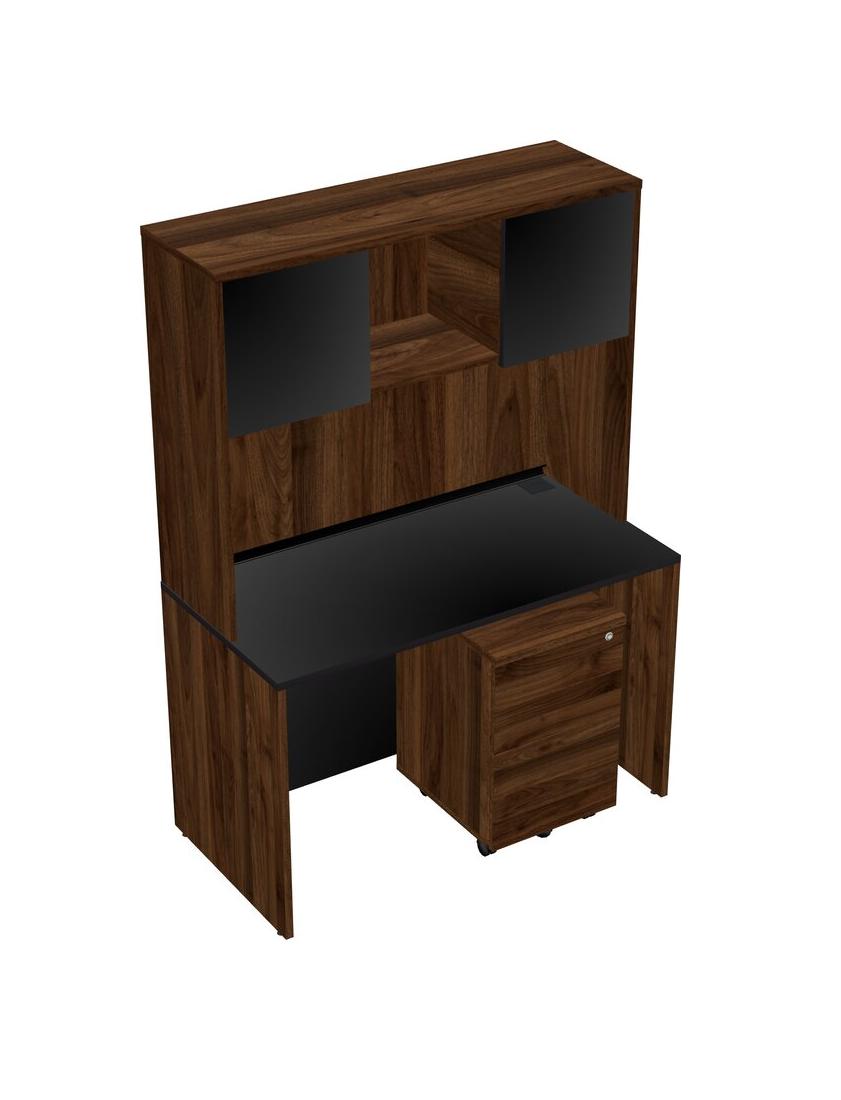 Black Rectangular Office Desk Plus Columbia Walnut Wooden Mobile Drawers And Columbia Walnut Hutch