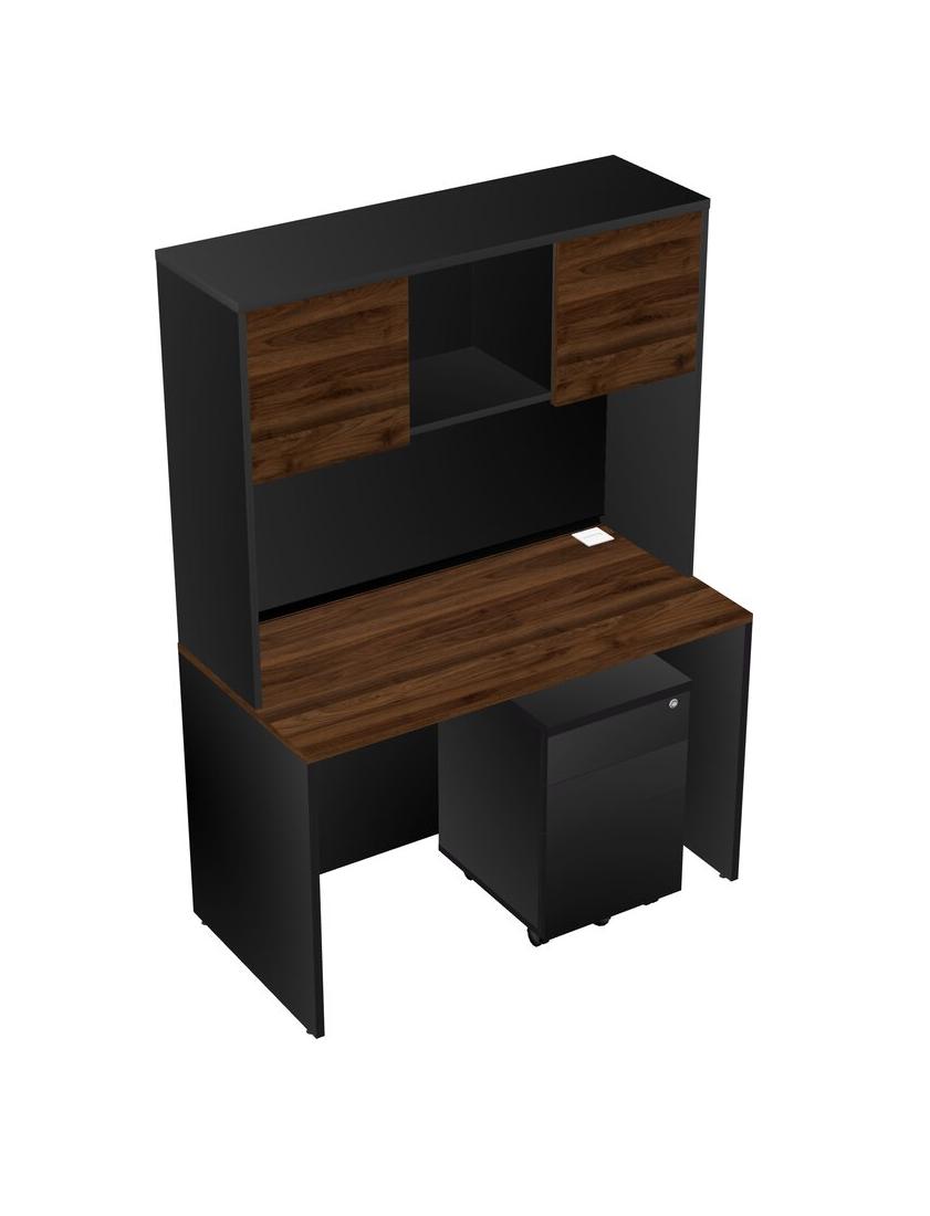 Columbia Walnut Rectangular Office Desk Plus Black Wooden Mobile Drawers And Black Hutch