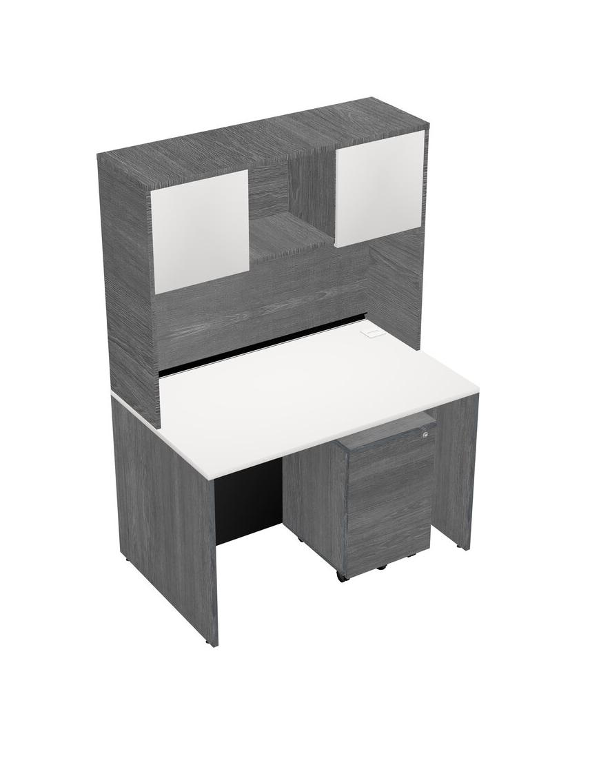 White Rectangular Office Desk Plus Grey Wooden Mobile Drawers And Grey Hutch
