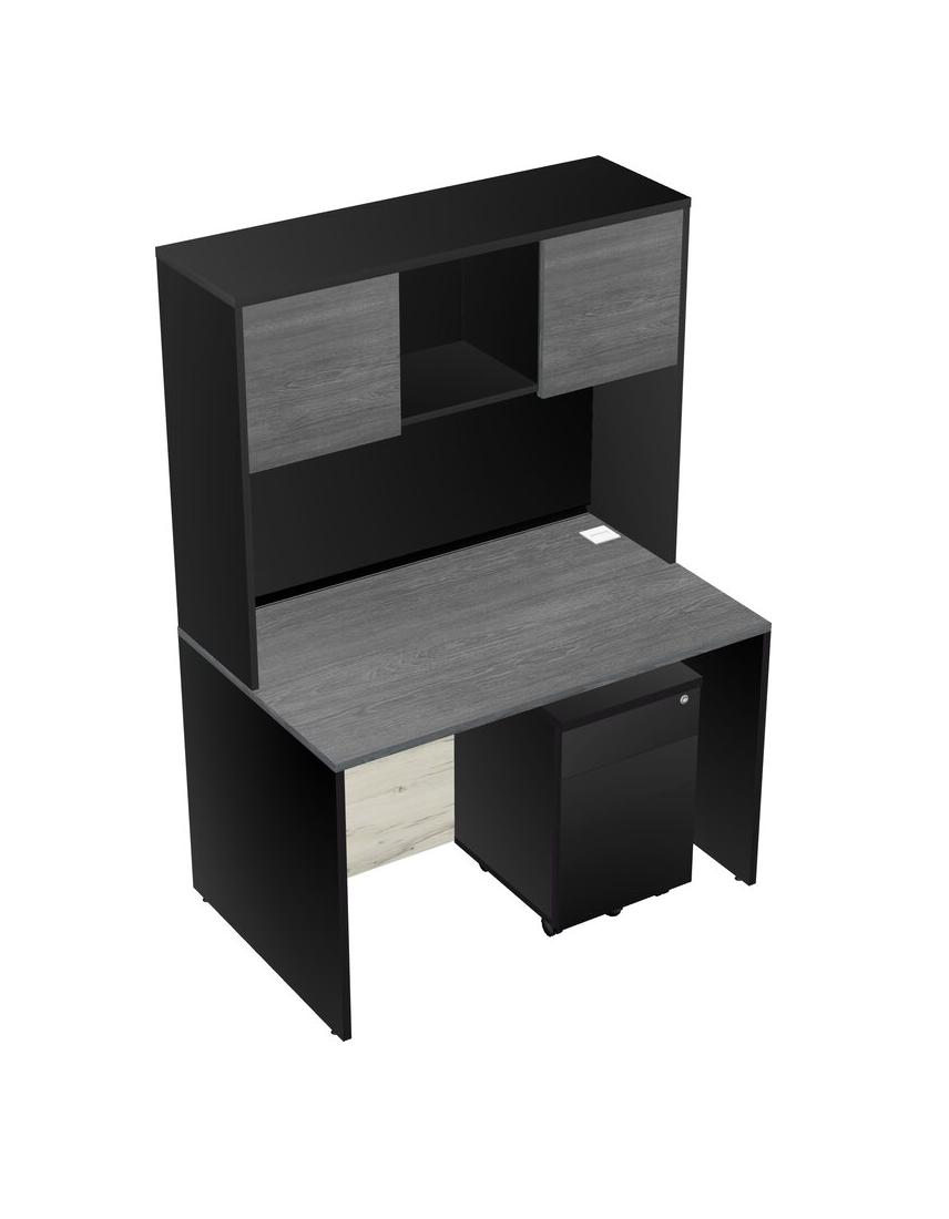 Grey Rectangular Office Desk Plus Black Wooden Mobile Drawers And Black Hutch