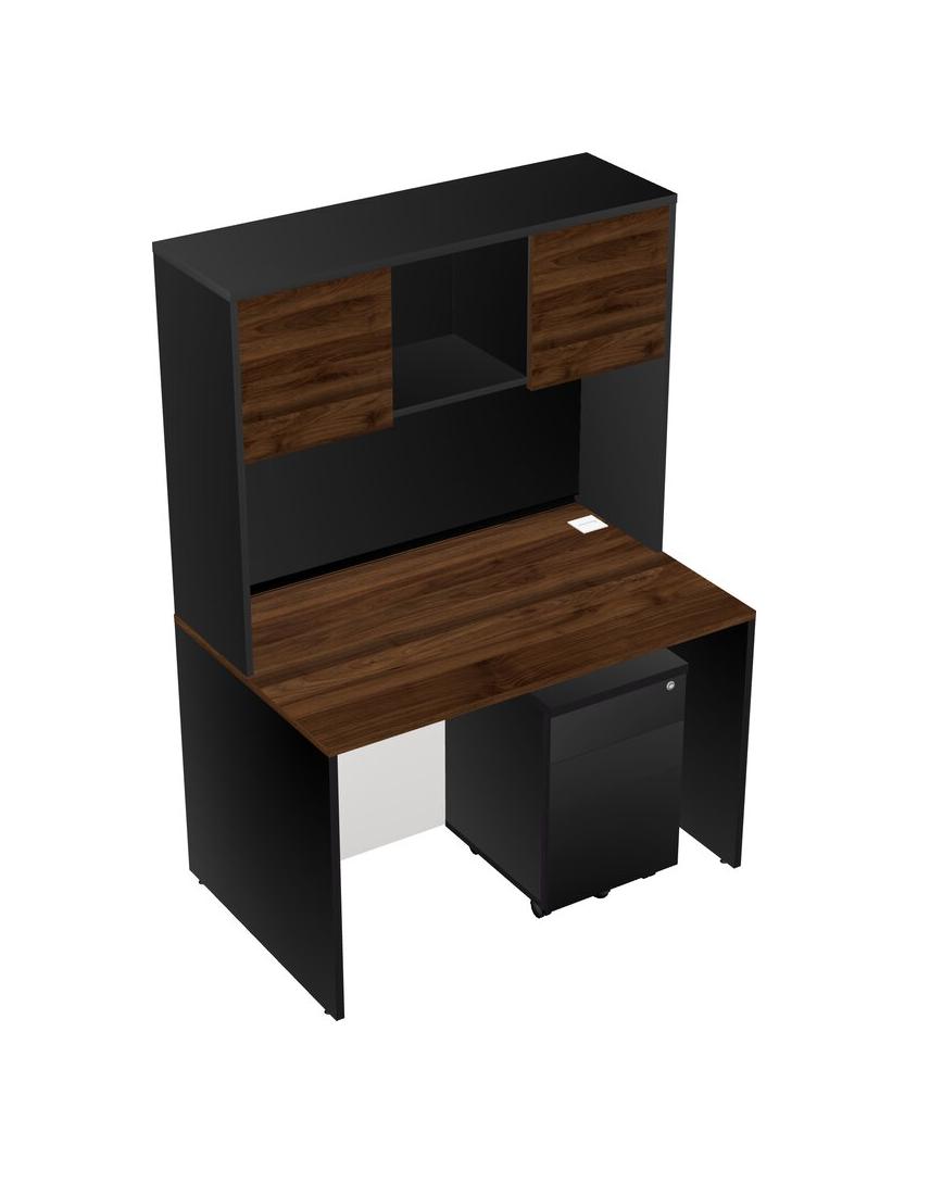 Columbia Walnut Rectangular Office Desk Plus Black Wooden Mobile Drawers And Black Hutch