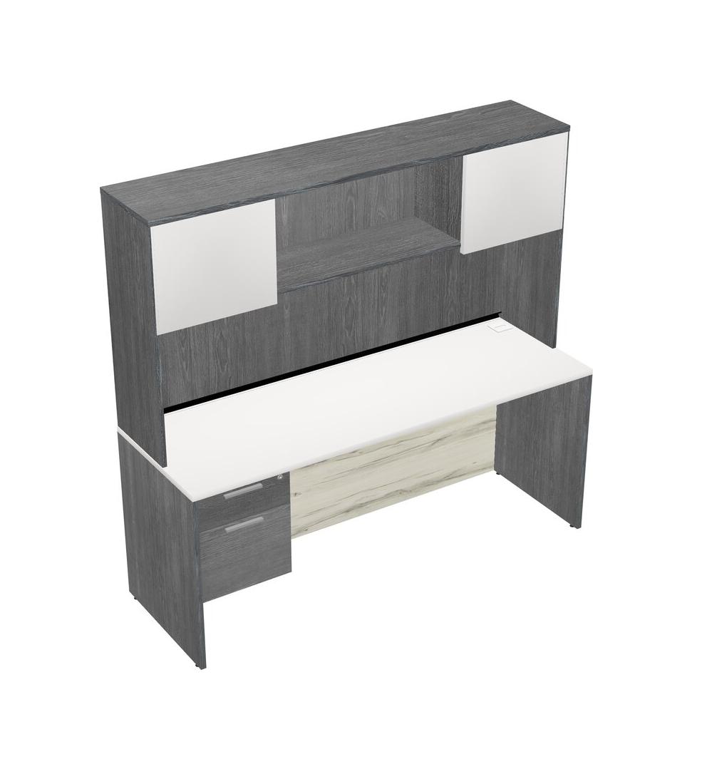 White Rectangular Office Desk Plus Grey Hanging Drawers And Grey Hutch