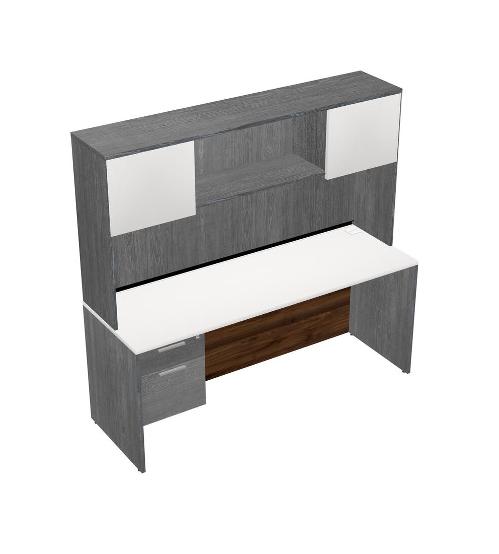 White Rectangular Office Desk Plus Grey Hanging Drawers And Grey Hutch