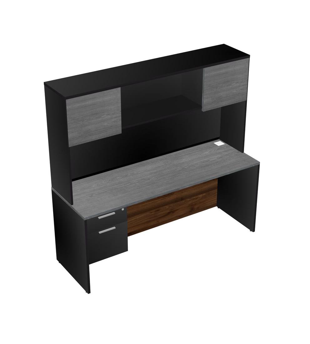 Grey Rectangular Office Desk Plus Black Hanging Drawers And Black Hutch