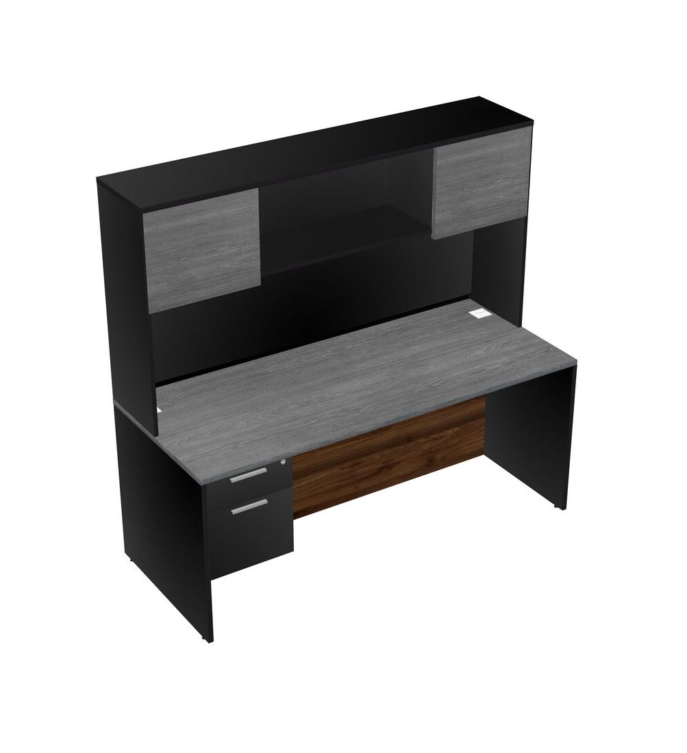 Grey Rectangular Office Desk Plus Black Hanging Drawers And Black Hutch