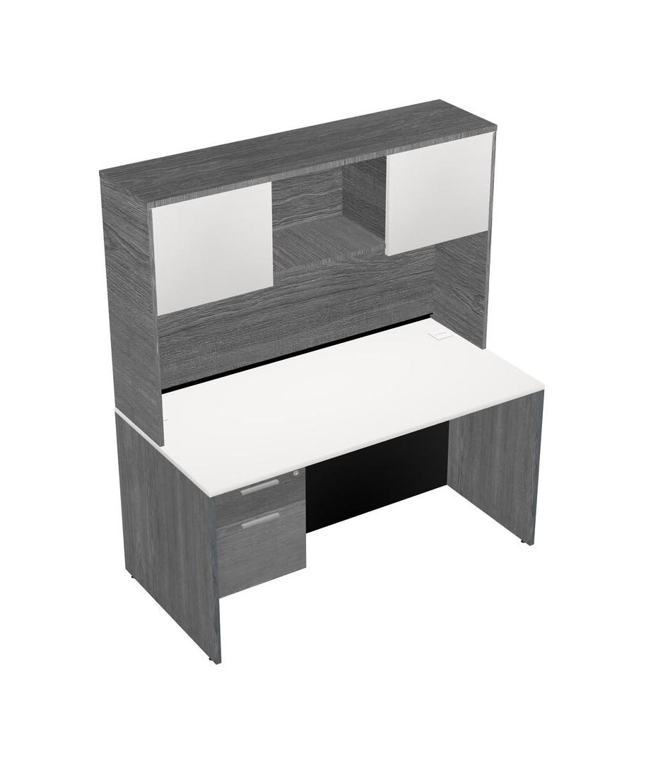 White Rectangular Office Desk Plus Grey Hanging Drawers And Grey Hutch