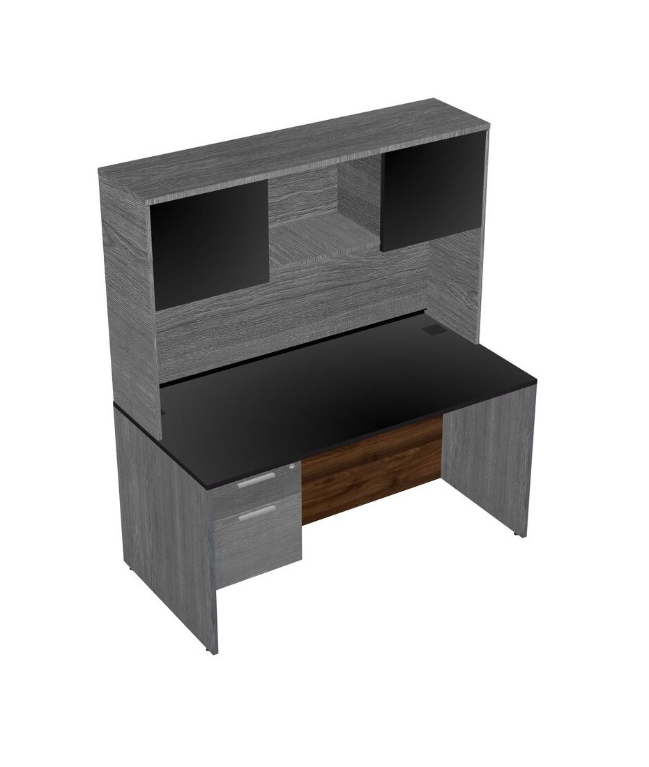 Black Rectangular Office Desk Plus Grey Hanging Drawers And Grey Hutch