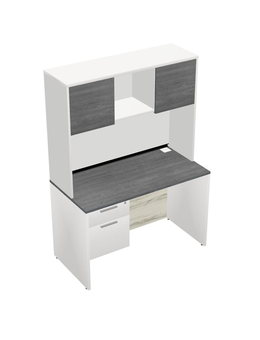 Grey Rectangular Office Desk Plus White Hanging Drawers And White Hutch