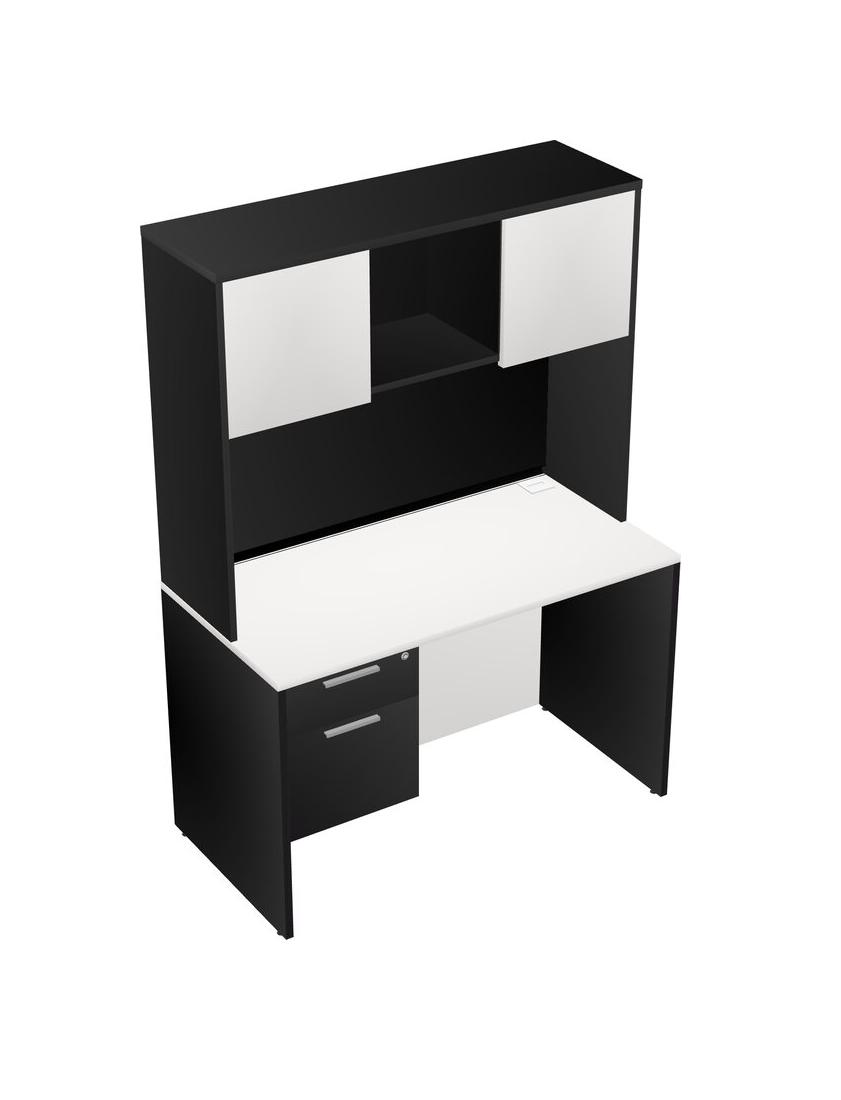 White Rectangular Office Desk Plus Black Hanging Drawers And Black Hutch