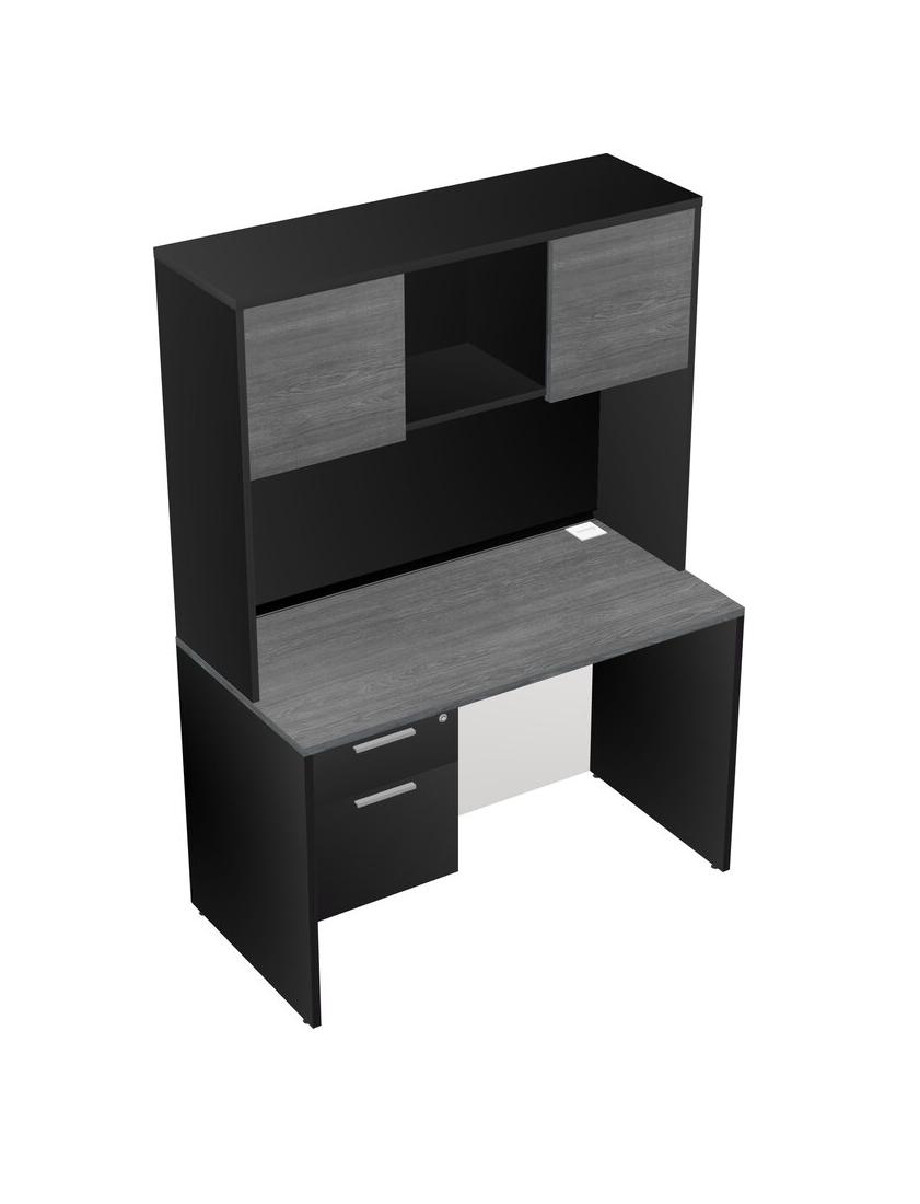 Grey Rectangular Office Desk Plus Black Hanging Drawers And Black Hutch
