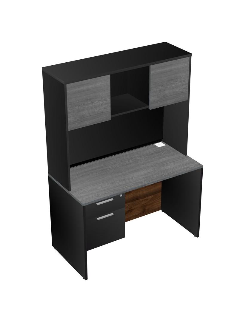 Grey Rectangular Office Desk Plus Black Hanging Drawers And Black Hutch