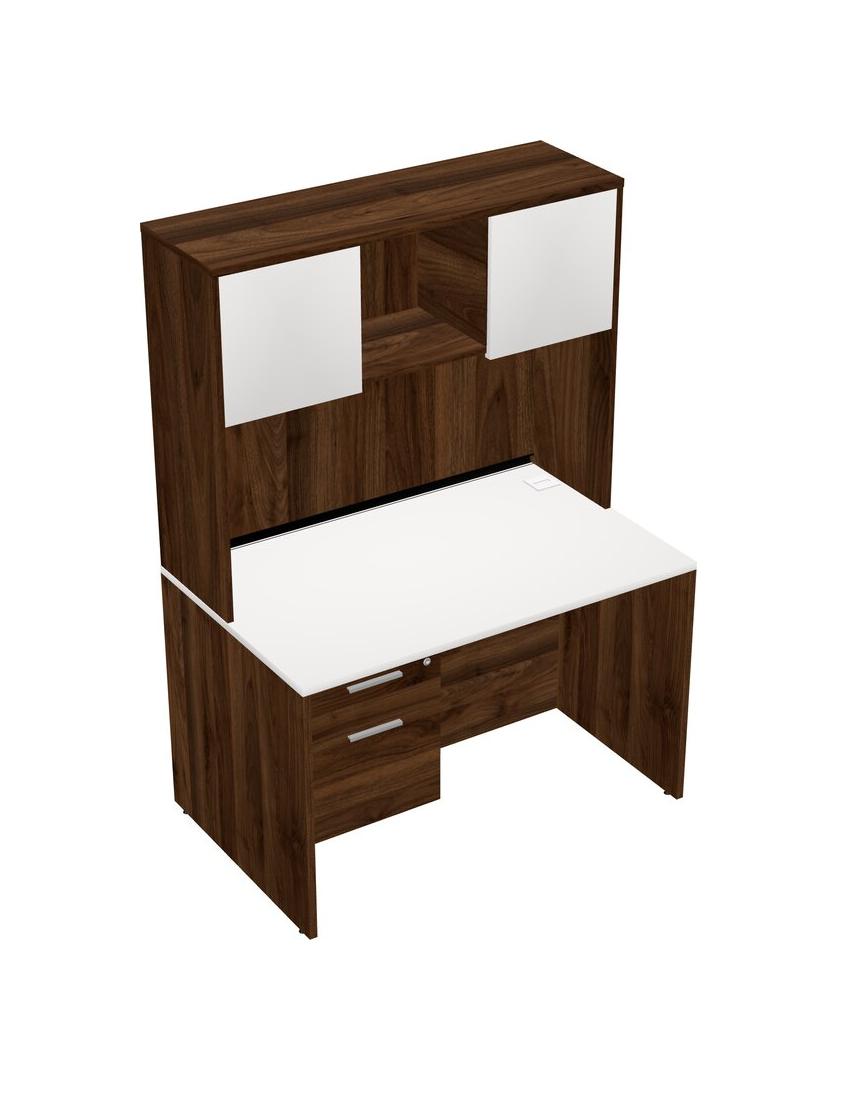 White Rectangular Office Desk Plus Columbia Walnut Hanging Drawers And Columbia Walnut Hutch